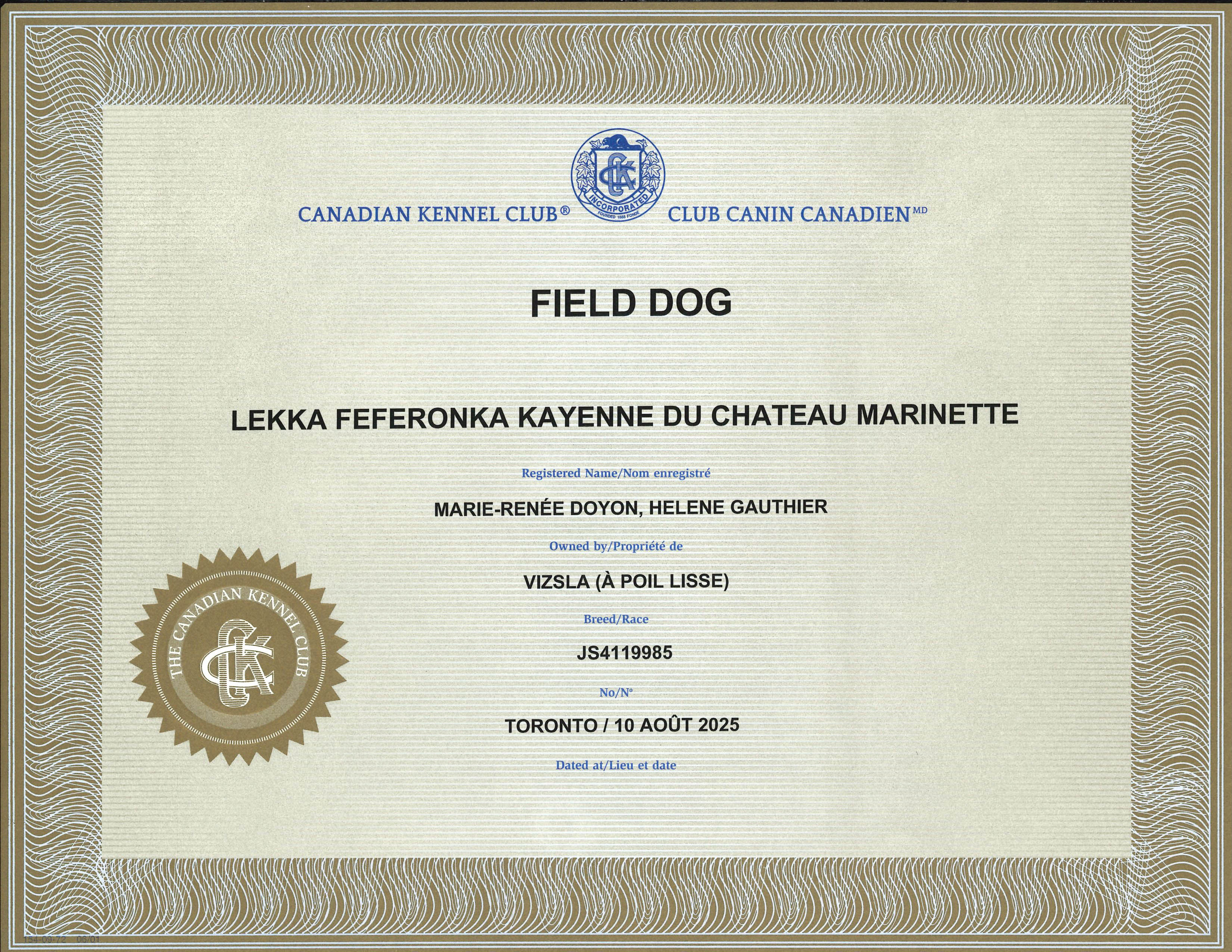 C'est en août 2025, sous une chaleur torride, que Kayenne a réussi les deuxième et troisième tentatives nécessaires à l'obtention de son titre de chasse de Field Dog du CKC. C'est tout un accomplissement d'avoir obtenu ce titre dans ces conditions.